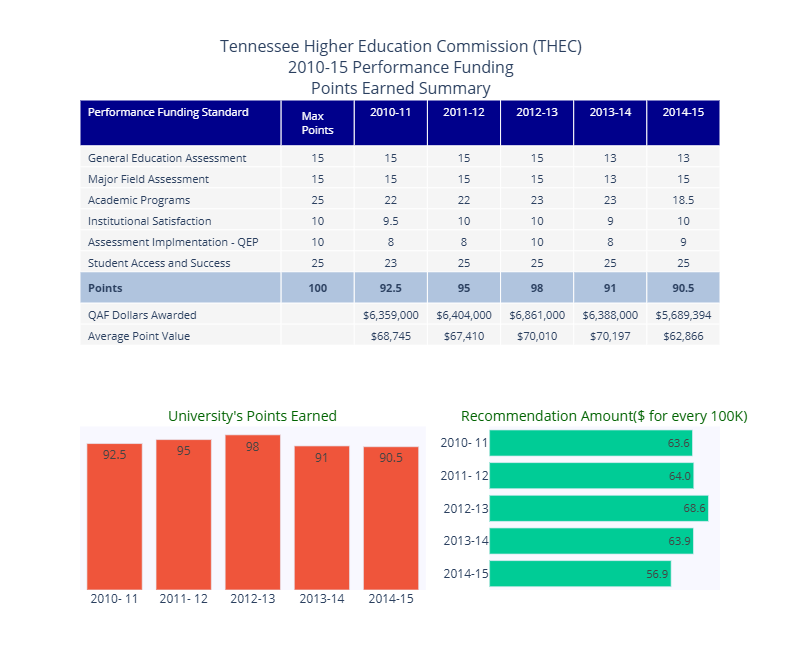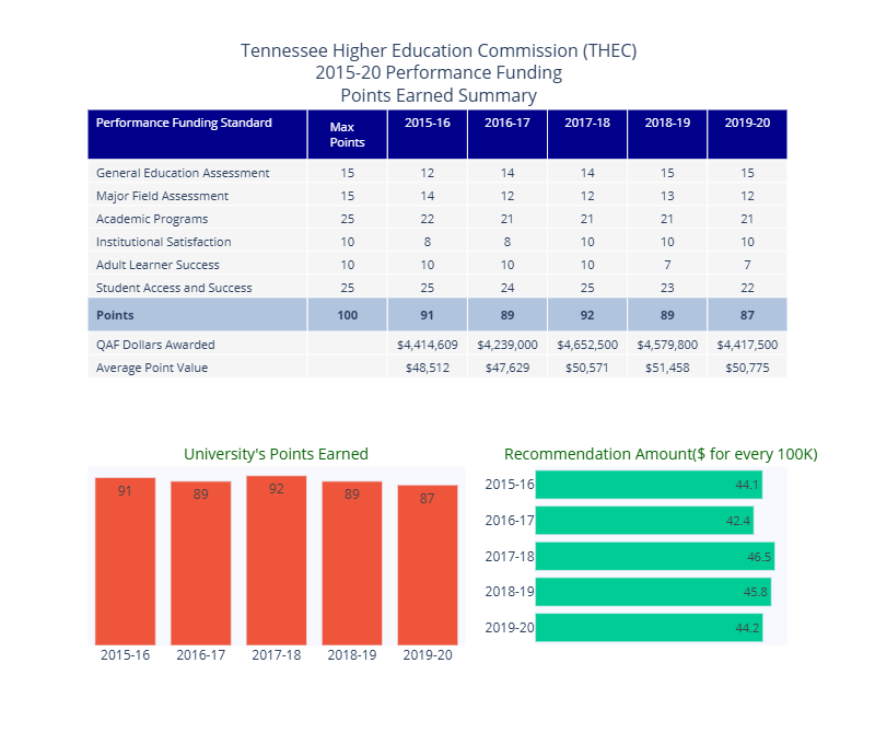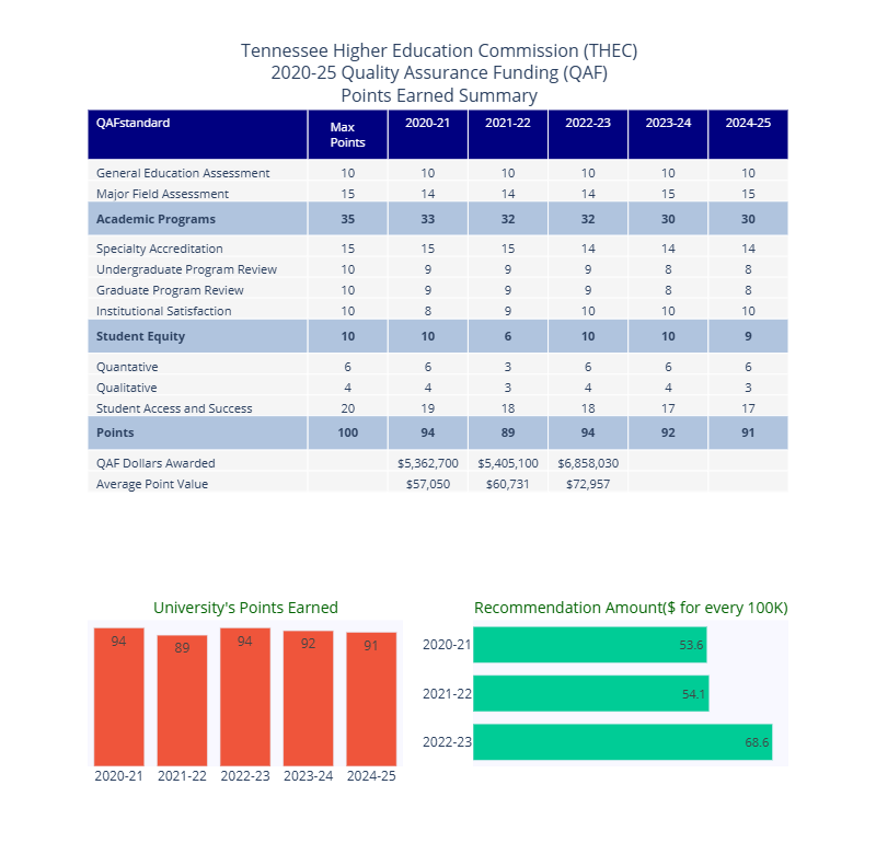 Under the quality assurance funding program, institutions can earn up to 5.45% over their operating budget. The program is based on a 100 point scale. This program is reviewed every five years by institutional representatives, governing boards, and the THEC staff for needed modifications. The current five-year cycle is 2020-2025 and addresses the following standards and maximum points awarded: